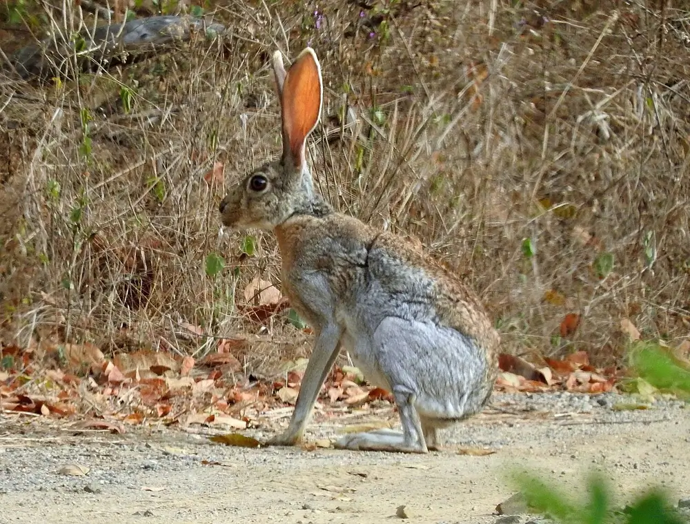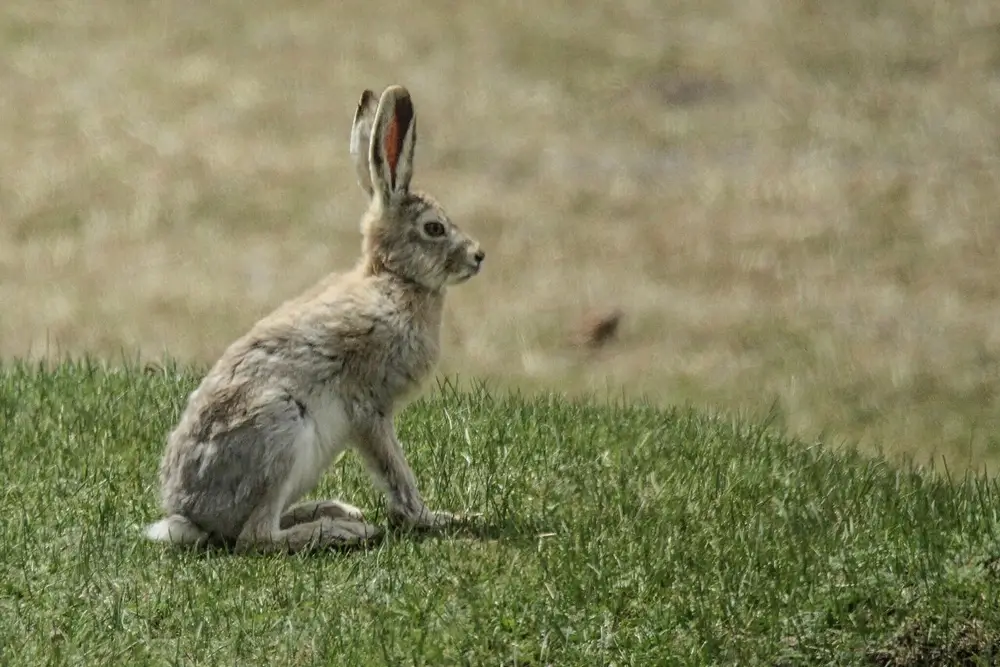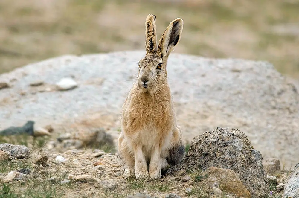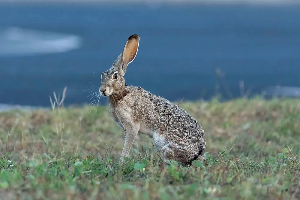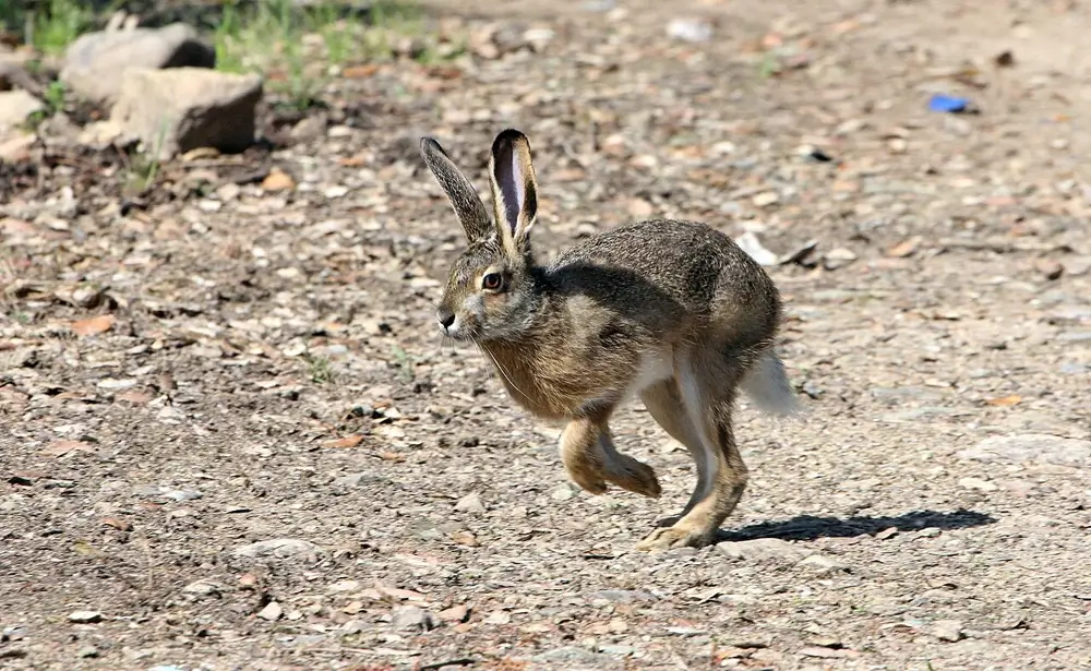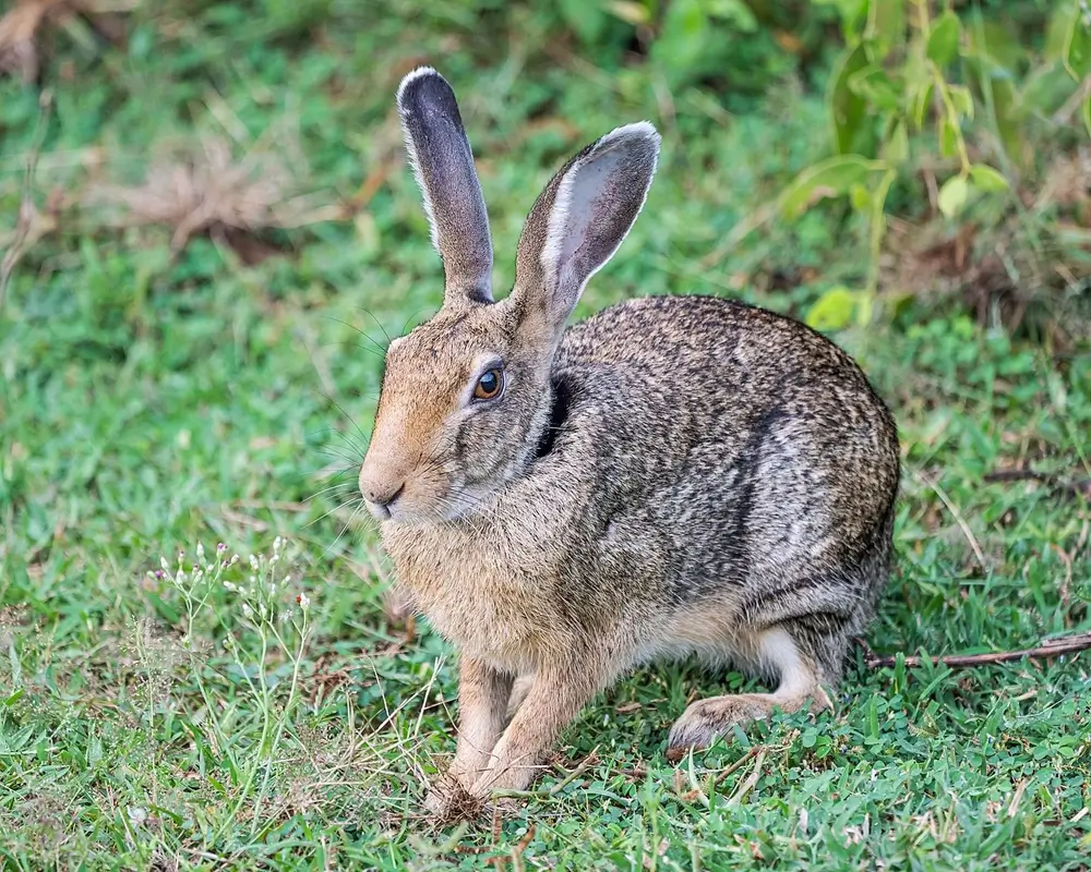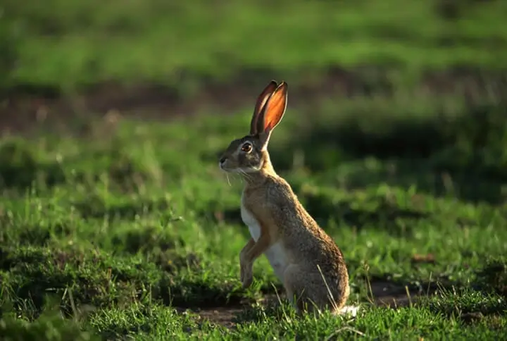 Rabbits and hares have soft fur, long ears, short tails, and powerful rear legs that they use to hop and jump. Hares are usually larger than rabbits. They have longer ears that are black-tipped and are born with fur and with their eyes open.