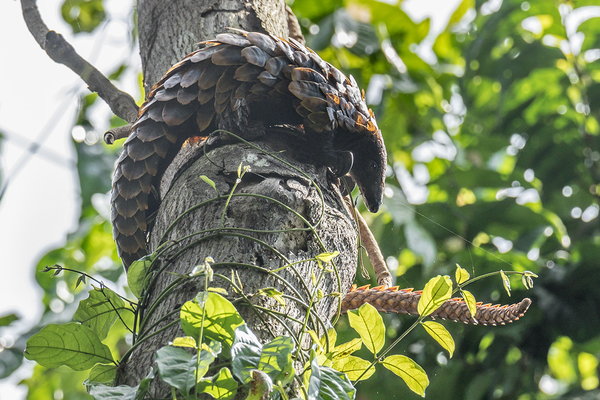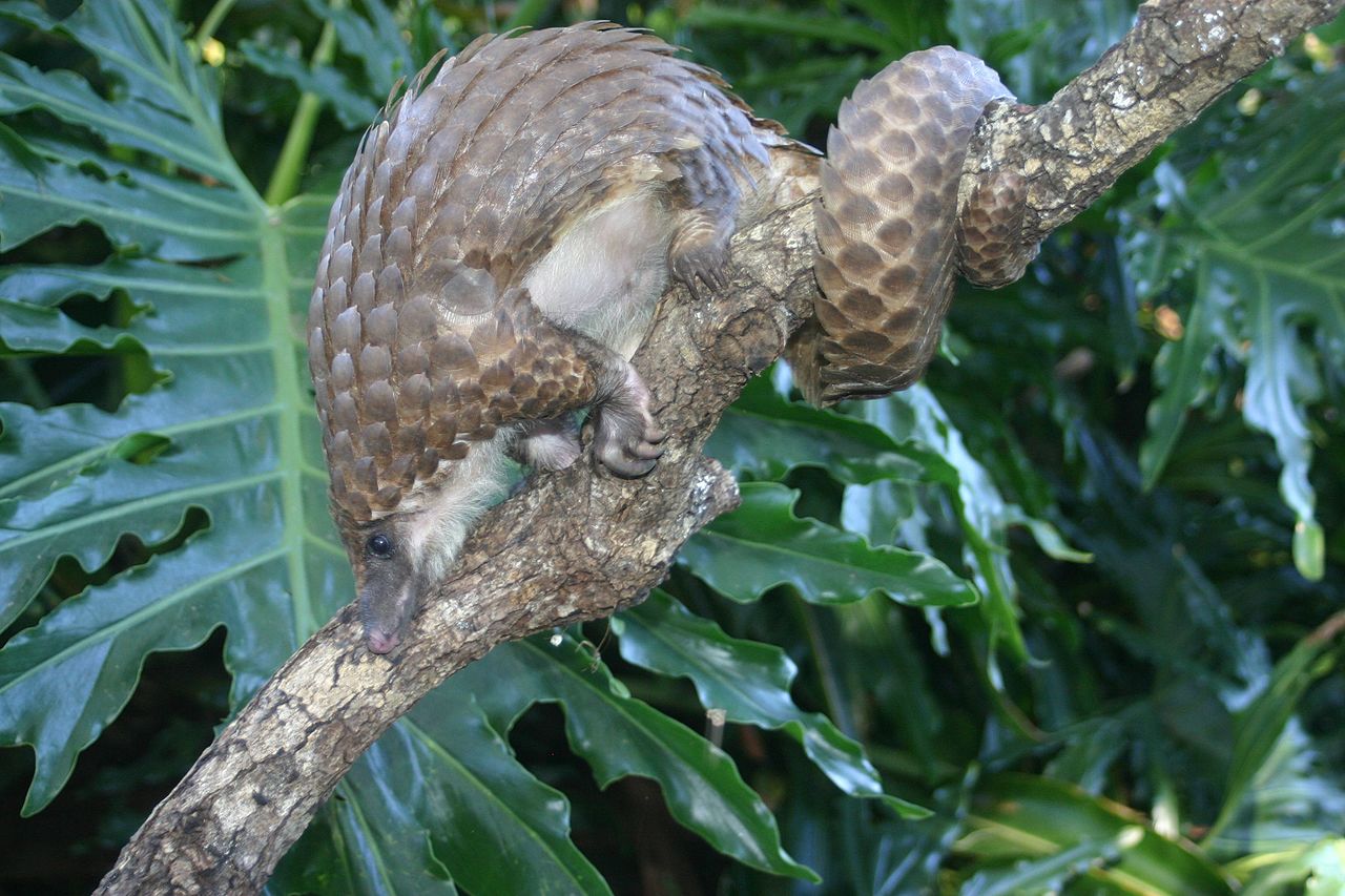 Pangolins are covered with razor-sharp scaly plates. When a pangolin is threatened, it curls up in a ball to protect its vulnerable underside.