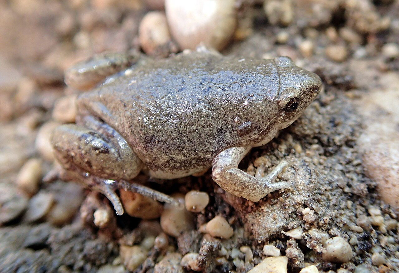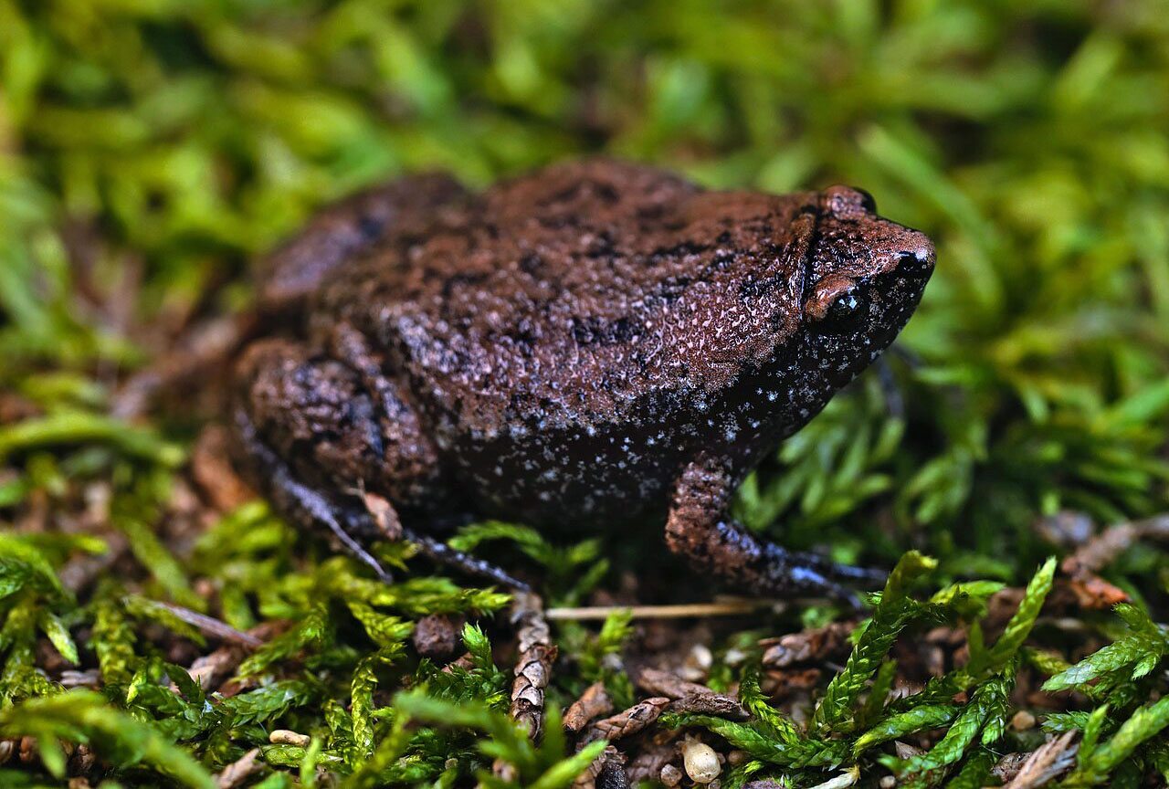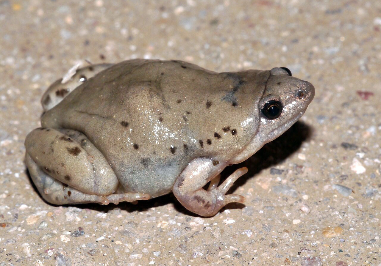 The Eastern narrow-mouthed toad has a small, pointed head; a narrow mouth; an oval-shaped body, short legs, and spotted grayish-brown skin. It is found in the southern United States.