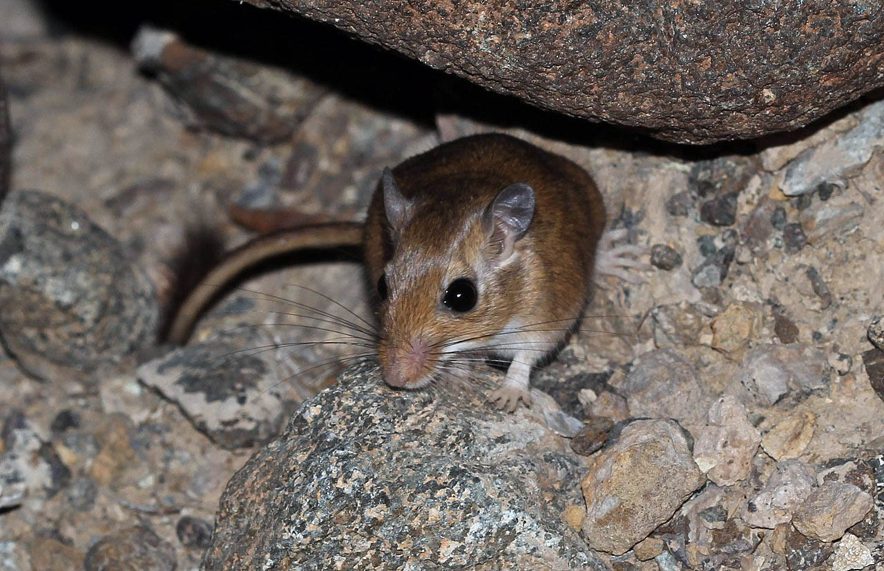 Many species in this family have small bodies, long tails, round ears, round eyes, and pointed noses with whiskers.