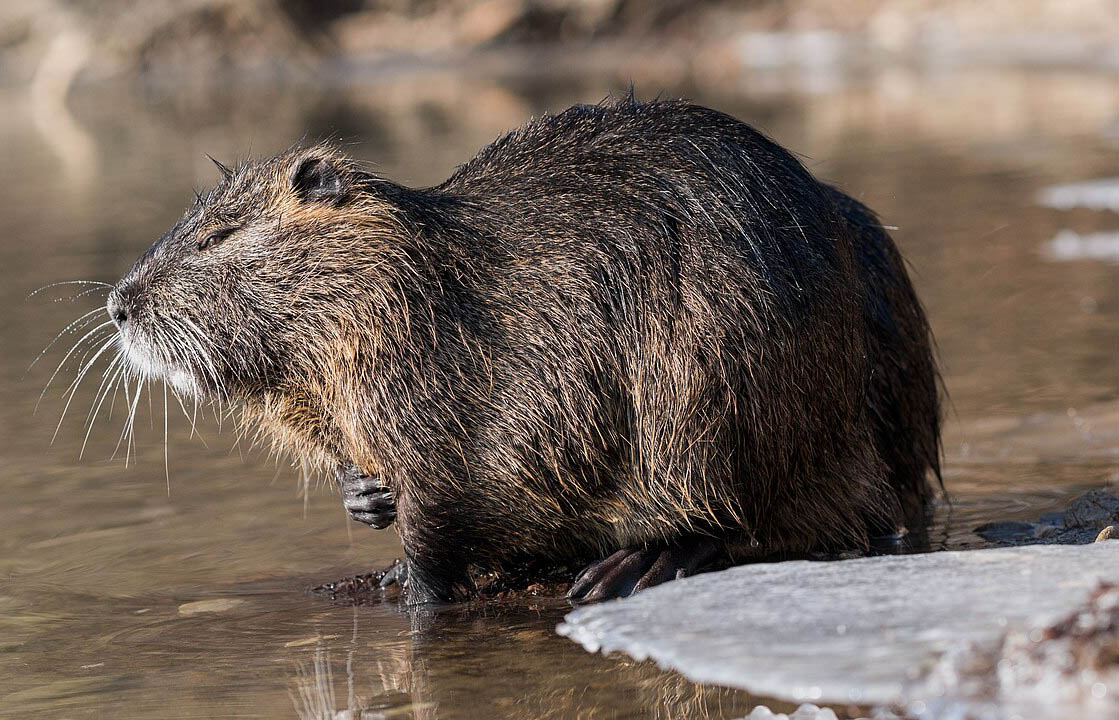 Nutrias are large aquatic rodents. They are about three feet in length and weigh around 30-35 pounds. They have thick, reddish-brown fur; short legs; webbed rear feet; small ears; and small eyes. They have big heads with a squared muzzle; long, round, lightly haired, pointed tails; and whiskers.