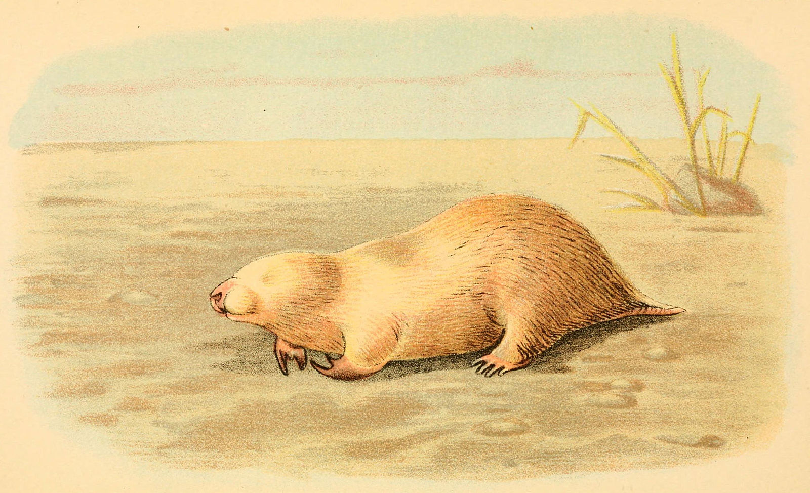 Marsupial moles are about 5 inches in length and have yellowish-brown fur, short tails, and pointed heads. They spend most of their lives underground and have many adaptations that help them live in the sand.