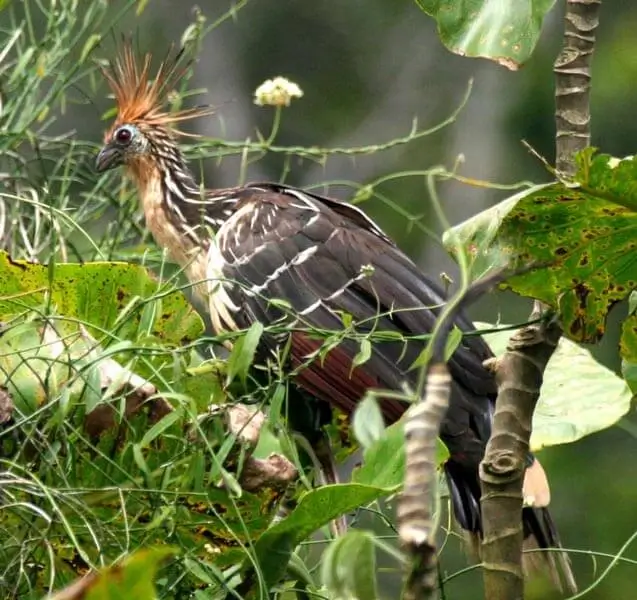 The hoatzin is about the size of a chicken – about 24-26 inches in length. It has a bright blue featherless face, red eyes, and a crest of feathers on its small head. It has a long neck and long tail feathers.
