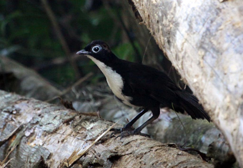 The logrunner is gray and brown. Males have a white throat, and females have a rusty-colored throat. Both the logrunner and the chowchilla are found in forests and usually live in male/female pairs.