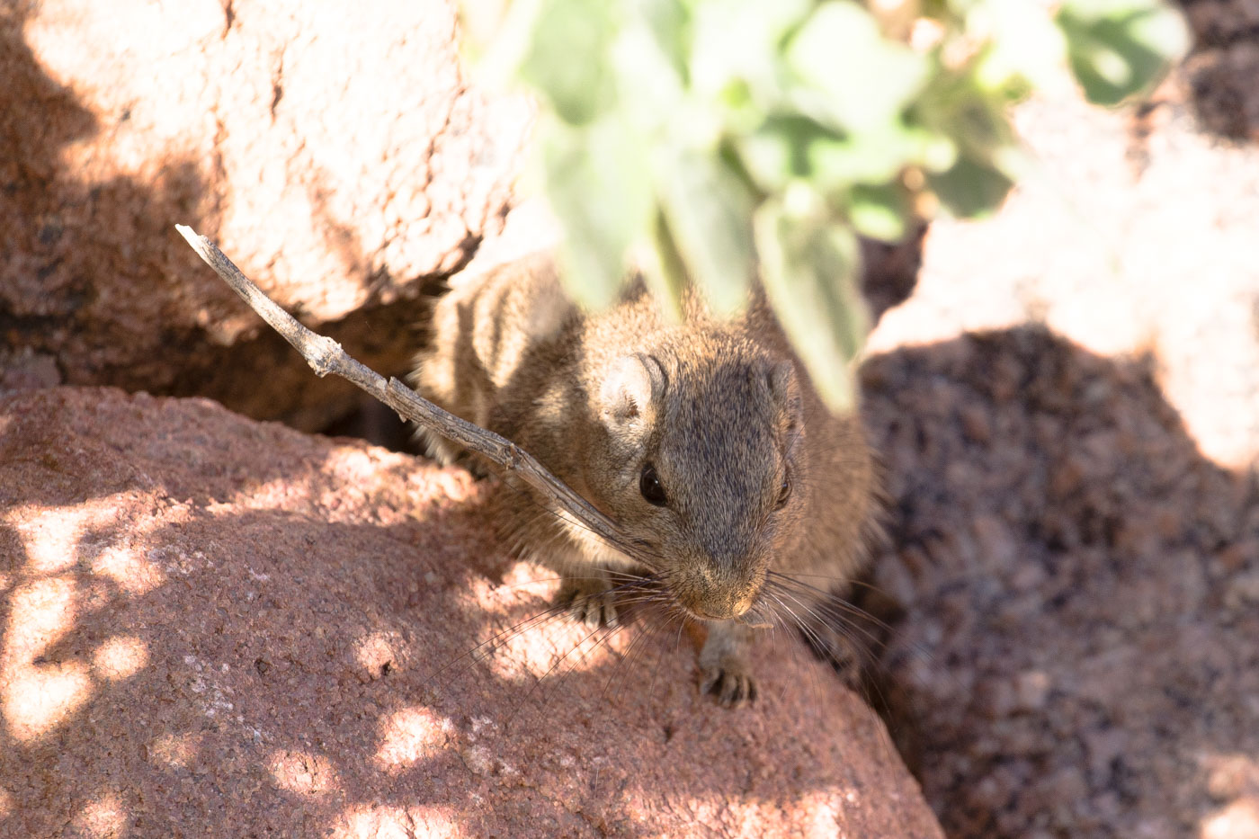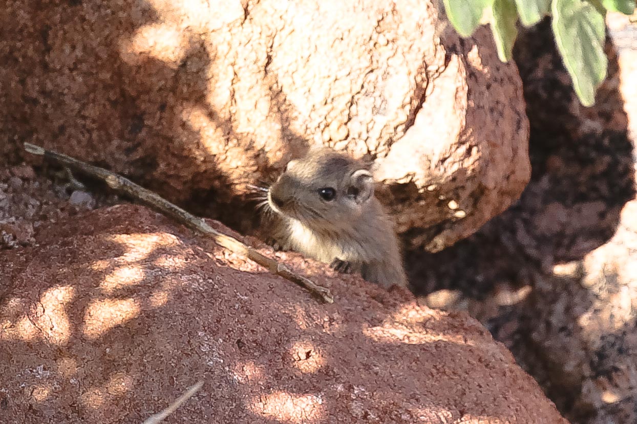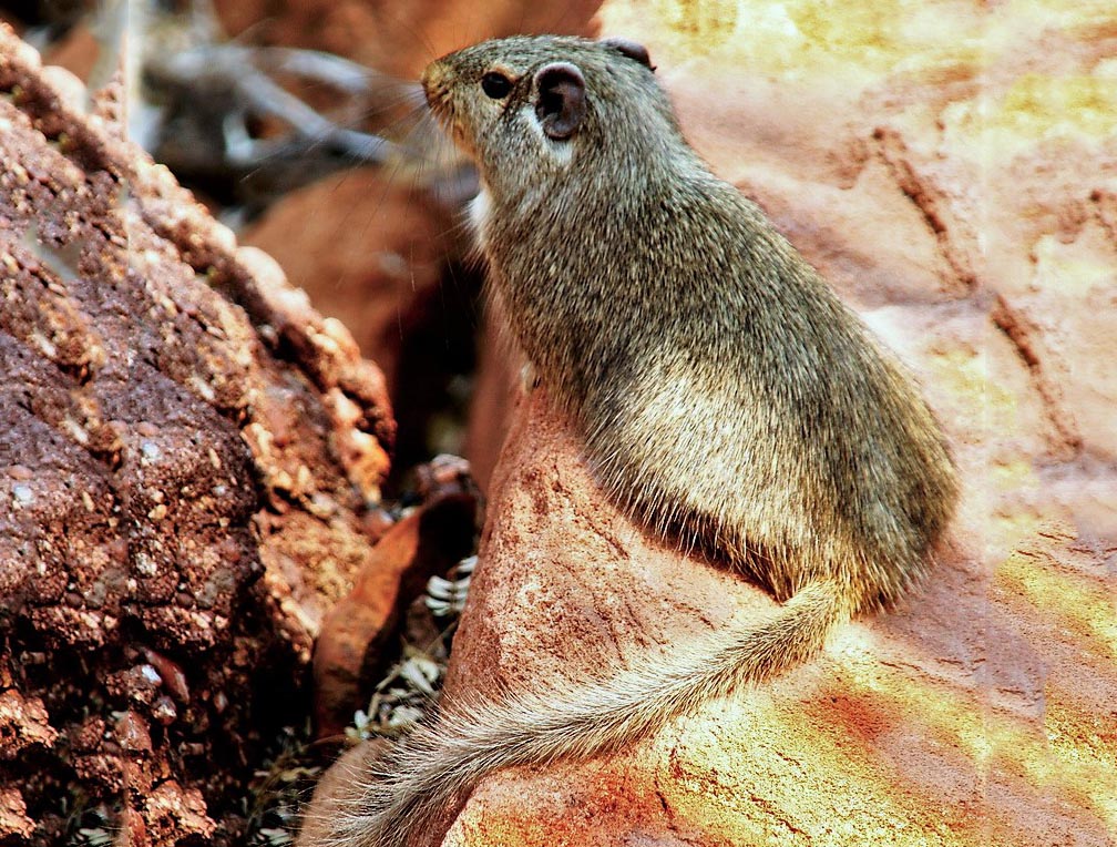 The dassie rat lives in rocky outcrops and is sometimes called the rock rat. It has a flattened skull and flexible ribs that make it easy for it to squeeze into tight openings in the rocks.
