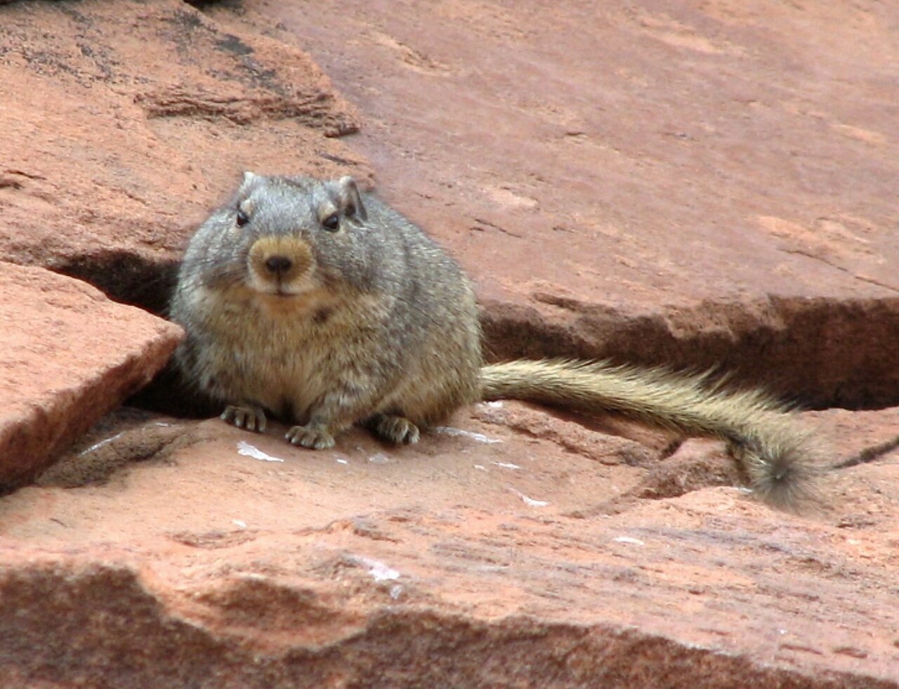 The dassie rat is 10-15 inches in length with a squirrel-like body. It has short, rounded ears; medium-length legs with clawed feet; a yellowish nose with long black whiskers; and a long, furry tail.