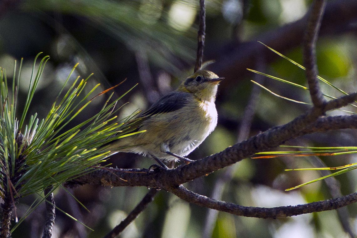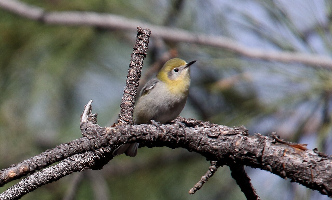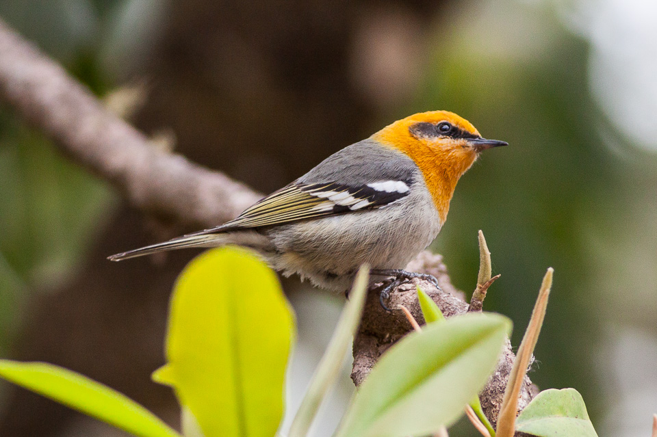 The olive warbler is about 4.5 inches in length and has a thin, pointed bill and long, thin legs.