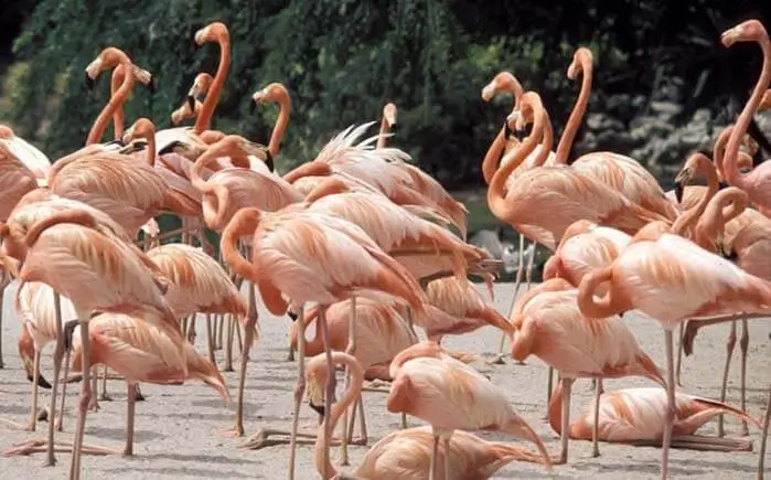 There are six species of large wading birds in this order. Flamingos are 3-5 feet tall and have long legs, long necks, and long, bent bills. Most species are pink, white, or red and are found in tropical fresh and salt water lagoons and lakes. One species, the