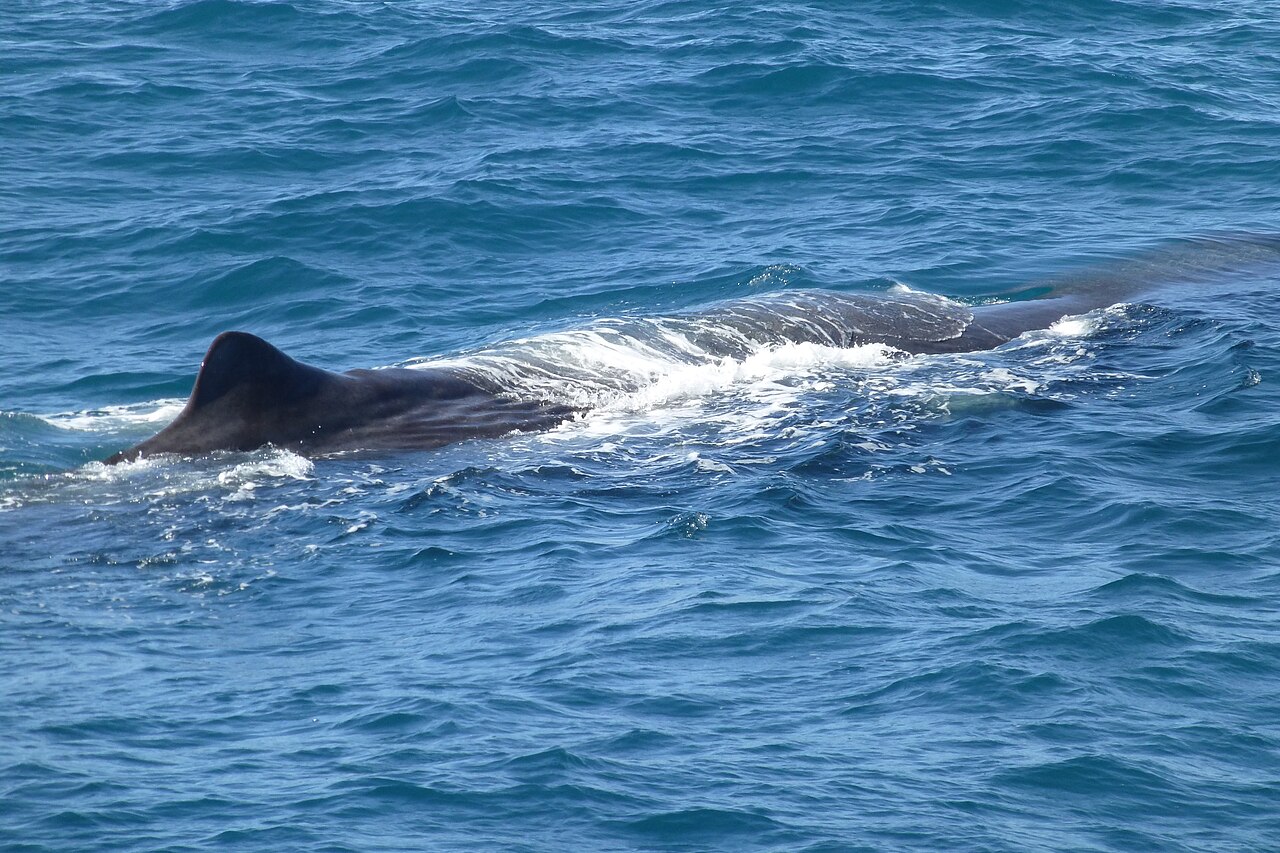 It has a single blowhole and small flippers. It doesn’t have a dorsal fin, but it has a hump on its back.