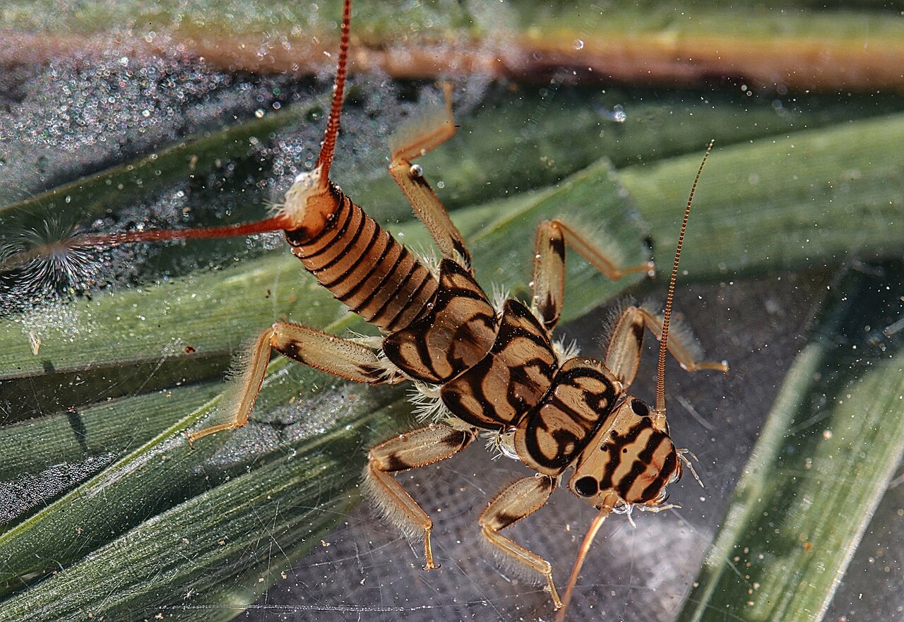 Adult stoneflies have long antennae and long cerci (rear antennae). Adult stoneflies have wings, but they usually stay on the banks of streams and rivers and eat algae or lichen. In some species, the adults don’t have mouths and die shortly after mating. The larvae live under stones in the water.