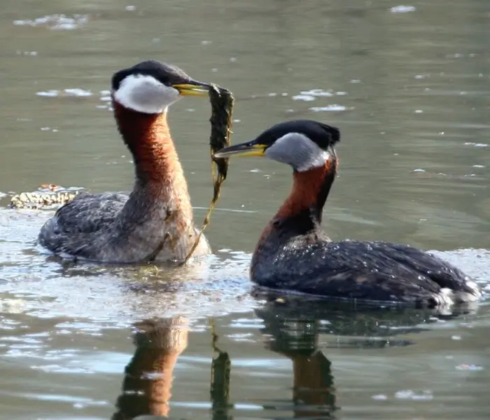 Grebes have stocky bodies; thick, waterproof feathers; long, slightly webbed, lobed toes; long necks; small heads; and small tails.