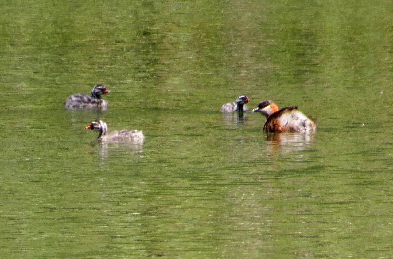 Grebes nest on floating aquatic vegetation. Both the male and the female care for the chicks and often carry them on their backs.