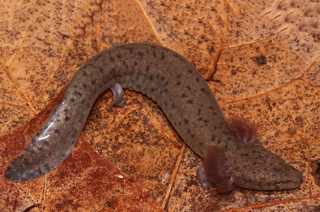 The species in this family are aquatic. They have feathery, red, maroon, or purple external gills and a fin-like tail. Most species are 8-15 inches in length.