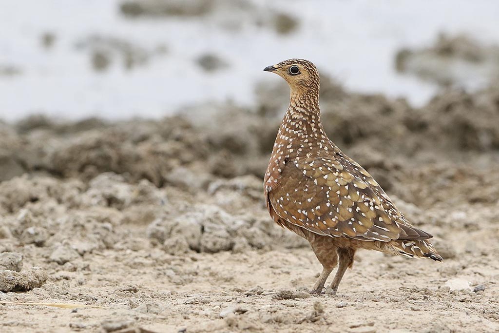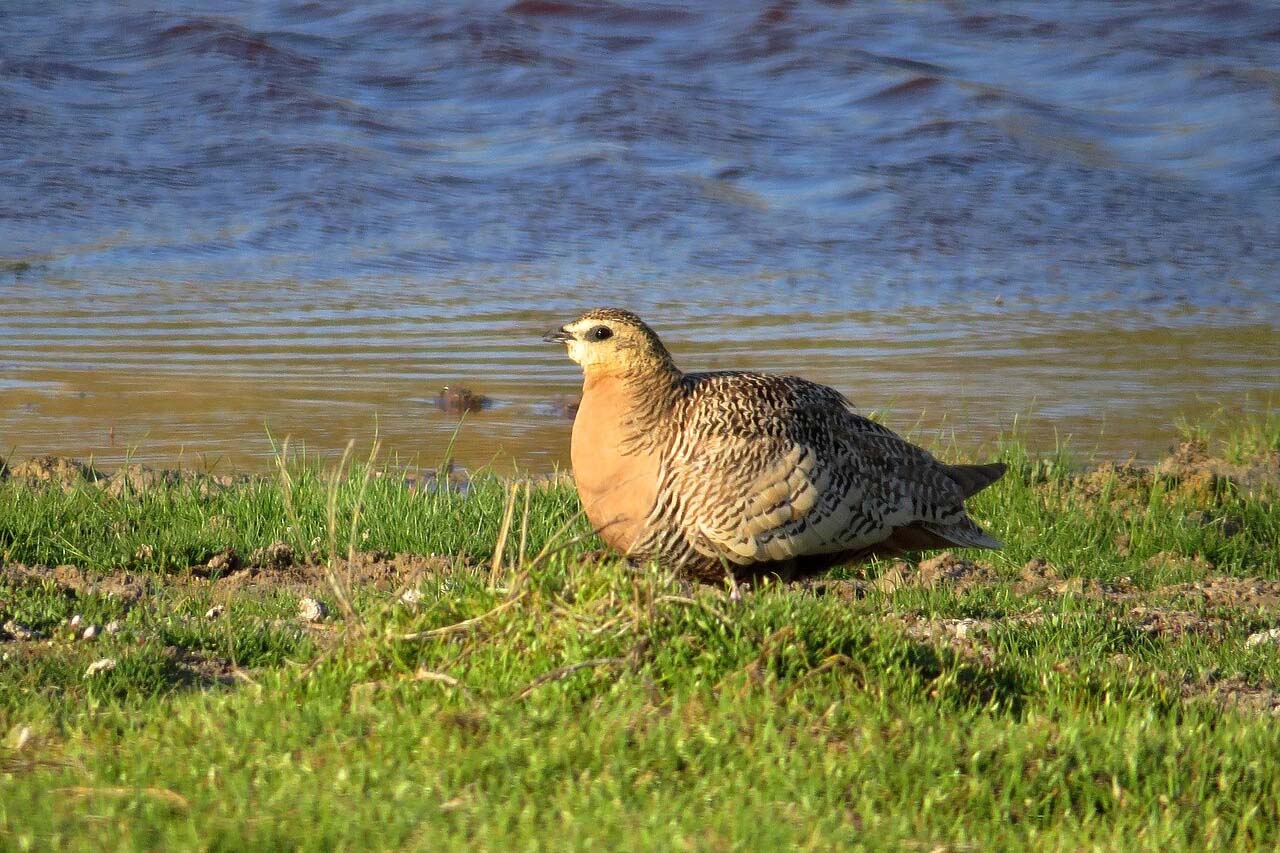 Sandgrouse are known for their special way of carrying water. Males soak the feathers on their bellies in water and then fly back to their chicks, who drink the water straight from the feathers.