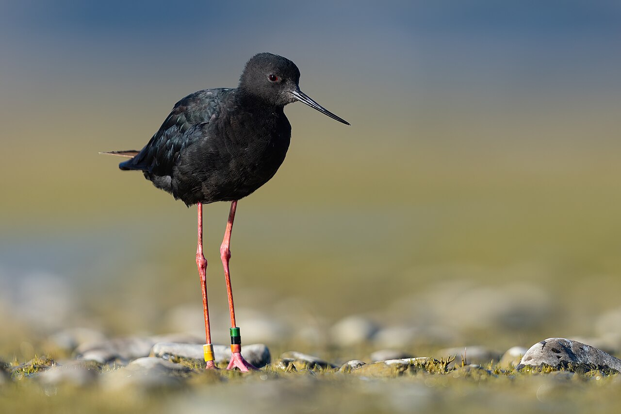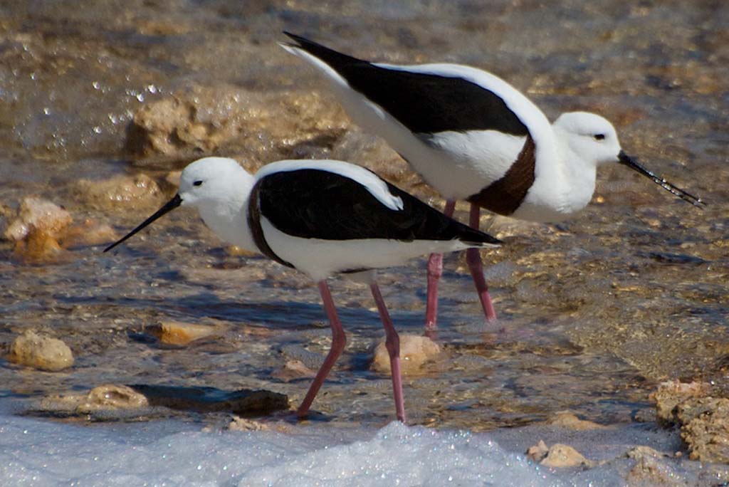 Stilts have reddish-pink legs, and avocets have grayish-blue legs. Avocets and the banded stilt have webbed front toes. The other stilts have partially webbed toes.