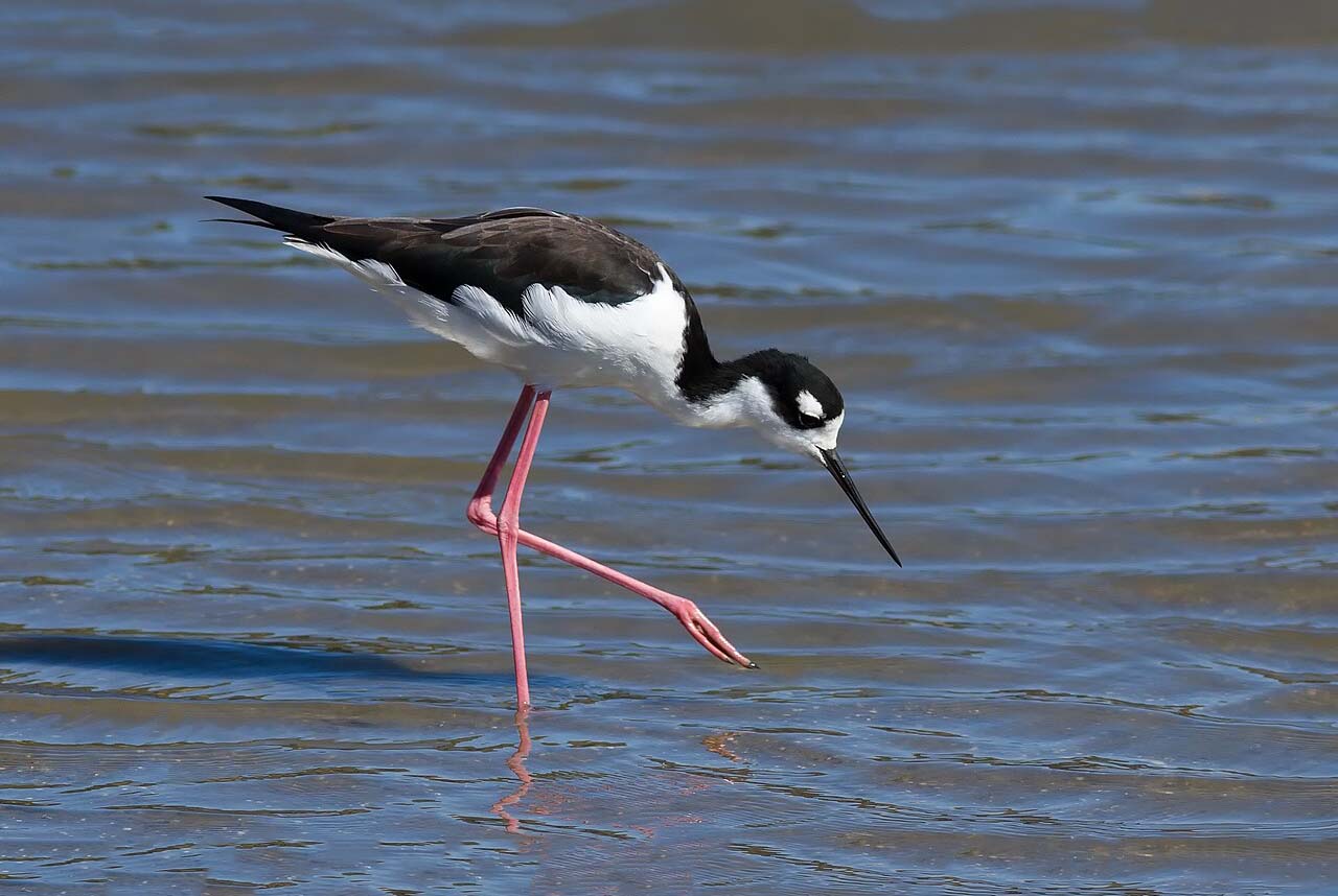 Avocets sweep their heads from side to side in shallow water and use their curved bills to feel for prey. Stilts locate their prey by sight and snatch it up in their long, straight bills.