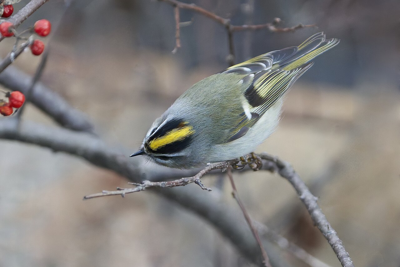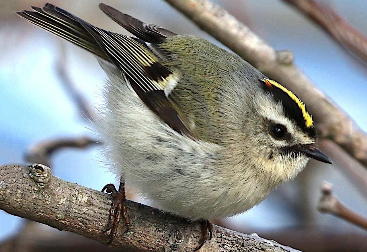 The golden-crowned kinglet is also olive green with white wing bars. It is about 3.5-4 inches in length.