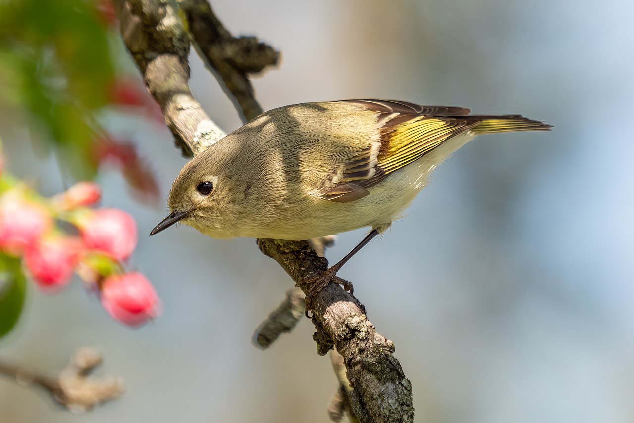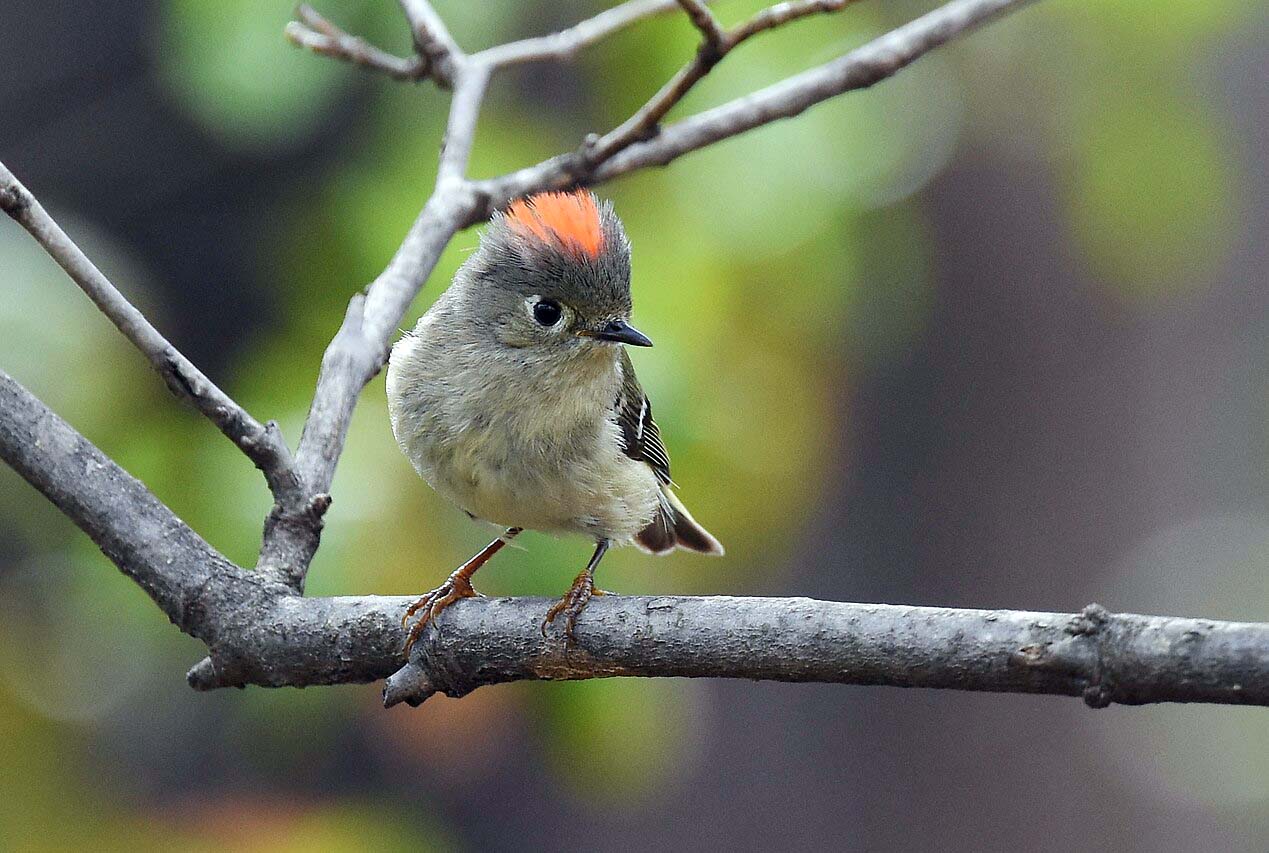 The ruby-crowned kinglet is about 4 inches in length. It is olive-green in color with white and black bars on its wings. The male has a red crown. It is found in coniferous forests in the summer and deciduous forests in the winter. Its breeding ground stretches from Alaska across to Newfoundland, Canada, south to southern California, the Great Lakes, and northern New England.