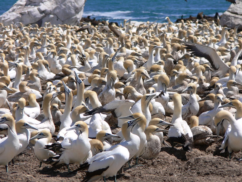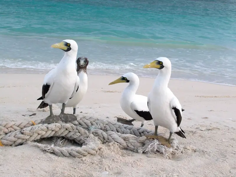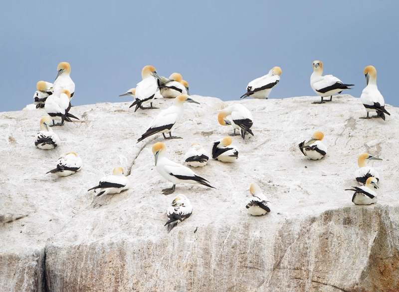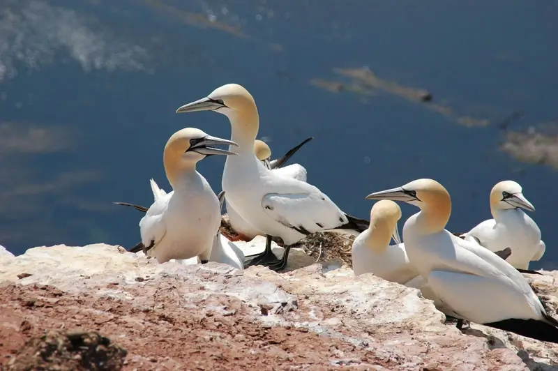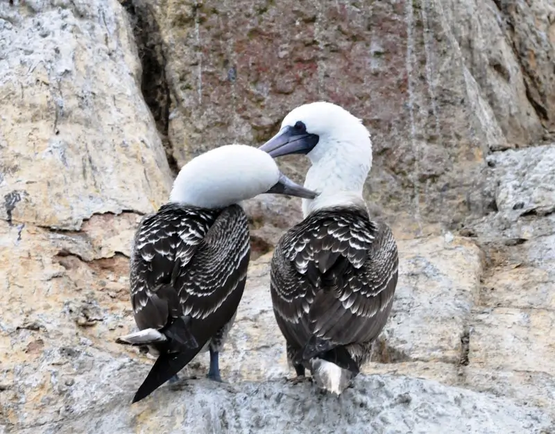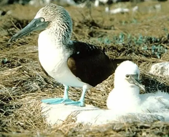 They breed and nest in colonies. Nests are made on cliffs, rocky islands, or in trees. Female boobies lay 2-3 eggs, and gannets usually only lay one egg.
